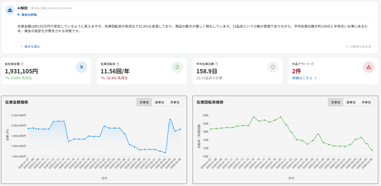 - 総在庫金額:現在保有している在庫の合計金額。資金がどれだけ在庫に滞留しているかを把握できます。